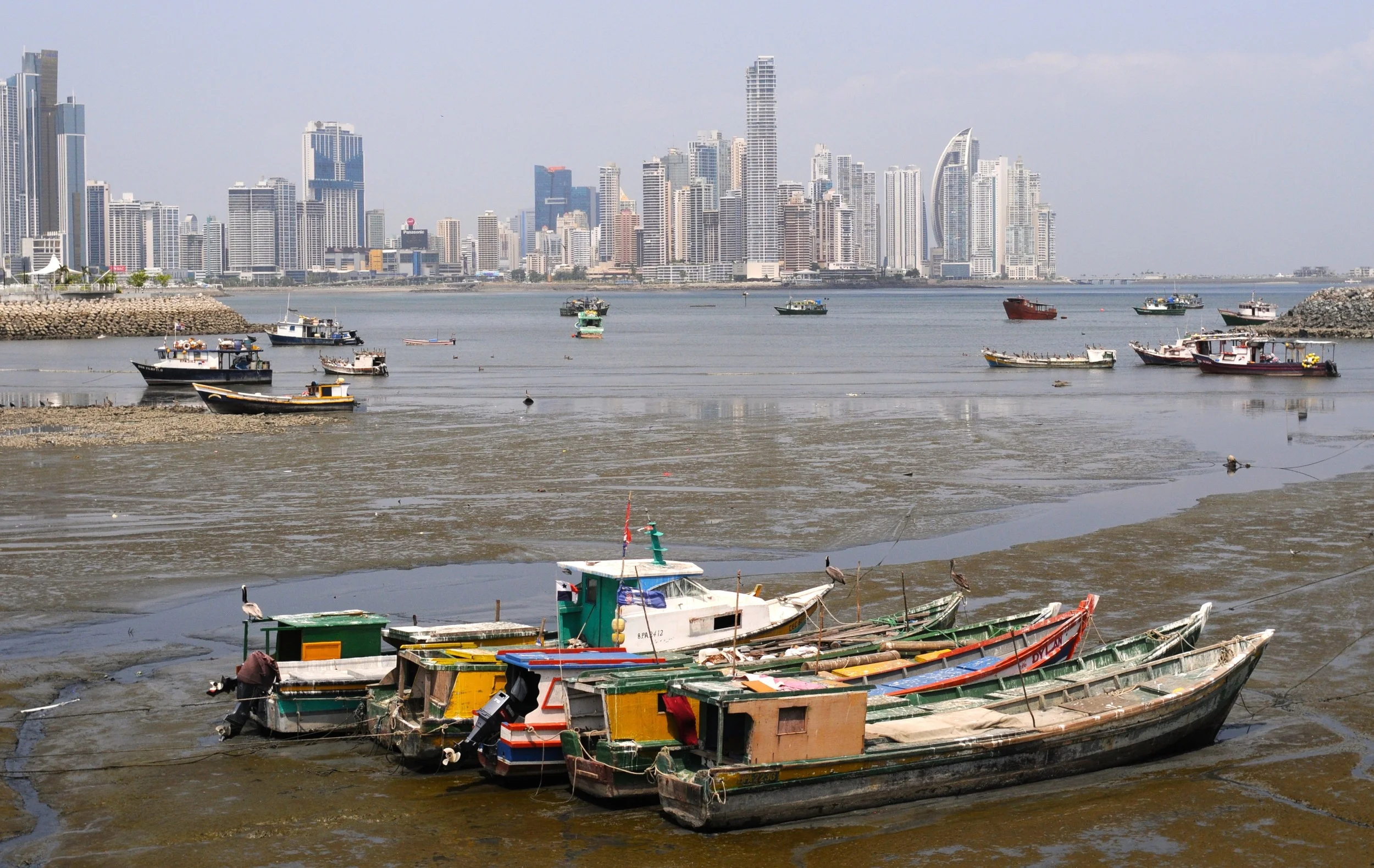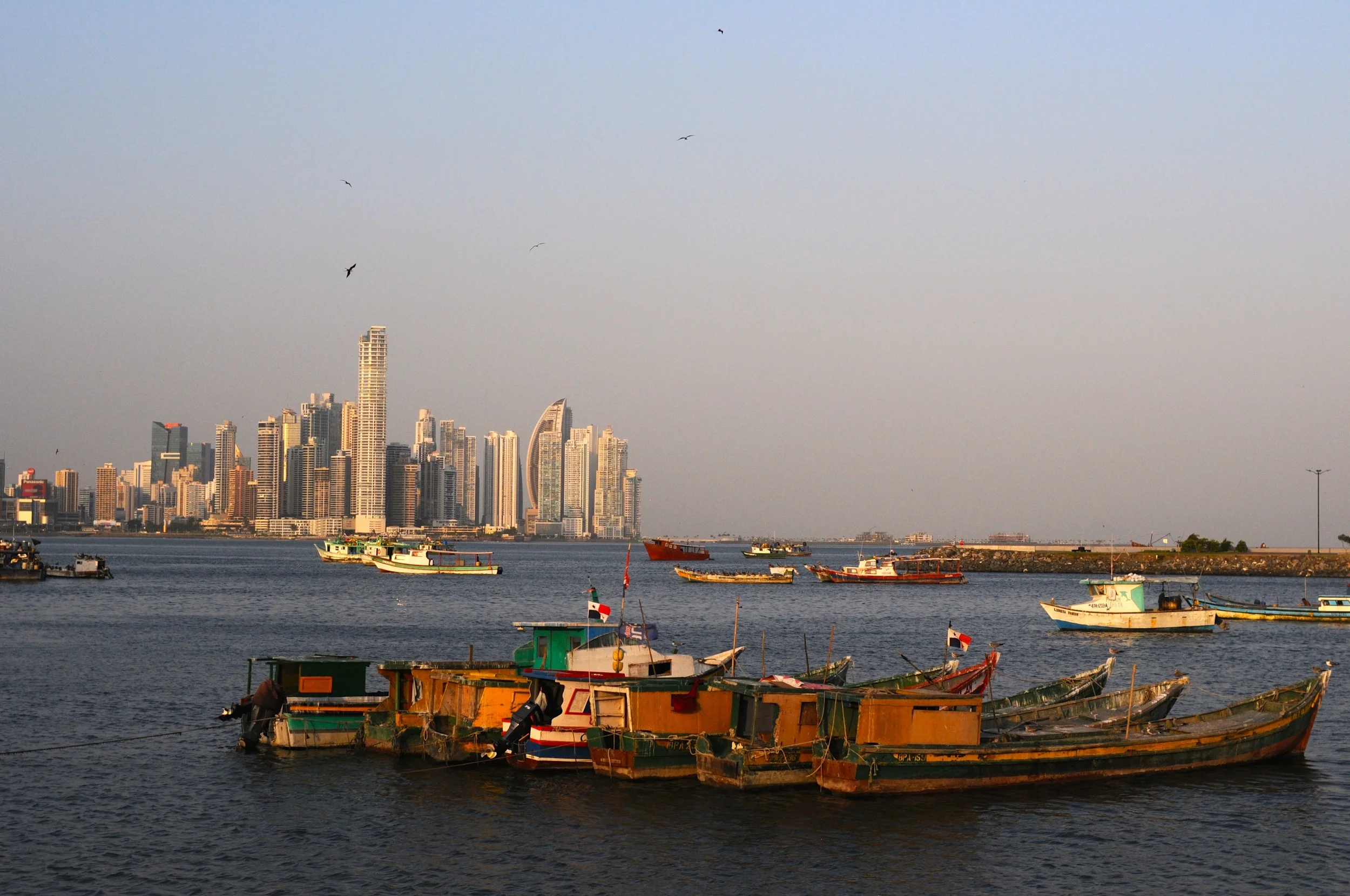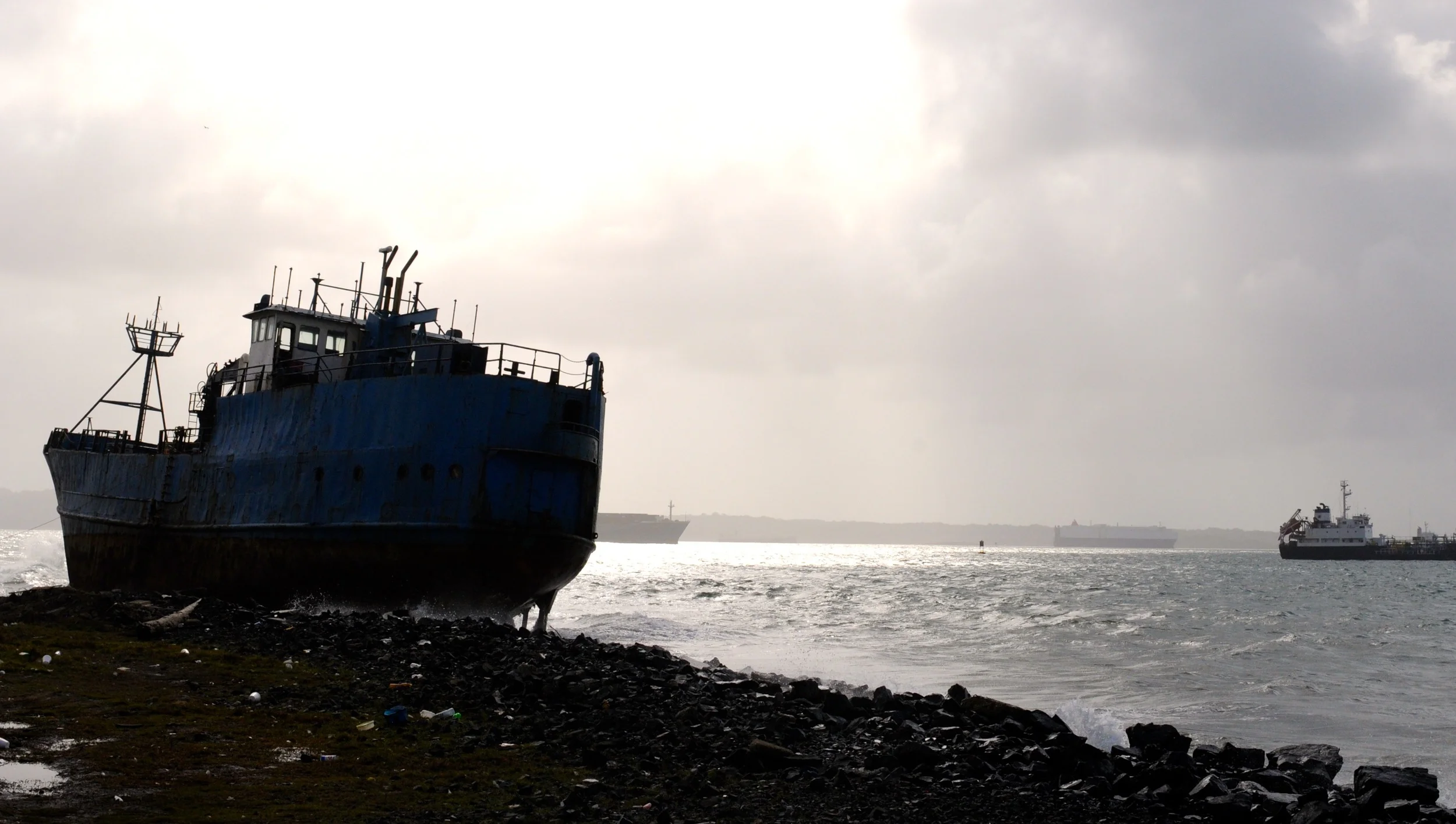 An abandoned ship sits outside the northern locks of the Panama Canal. Other ships are coming and going in the distance.